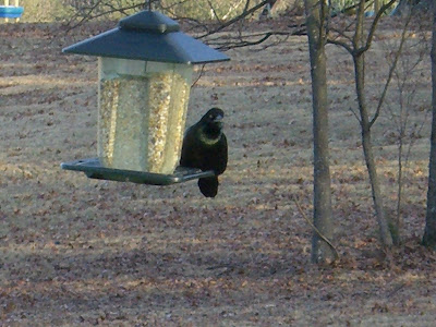 The Dove photo could be opne of mine as its such an identical scene in my yard this time of year. But, wow!!, what is that big black bird sitting on the feeder ledge? Does it have a white necklace? Its very intriguing looking.